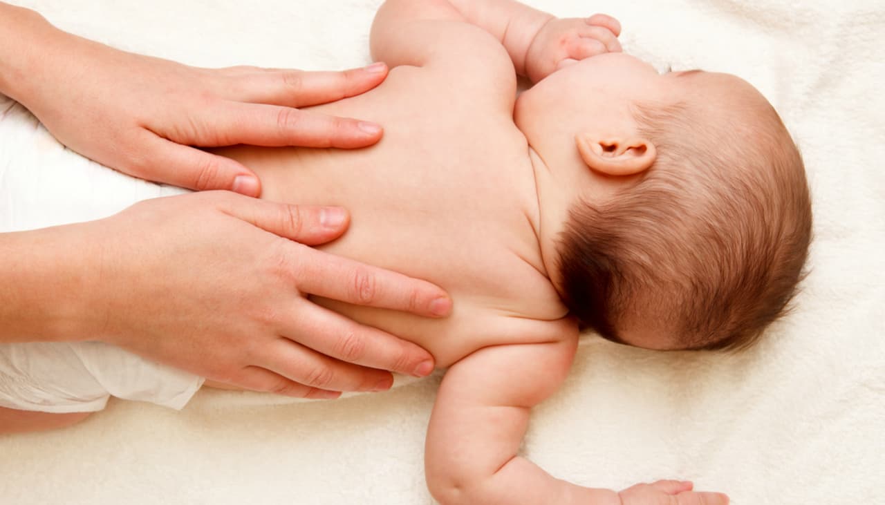 4. Boca abajo sobre el colchón o sobre tu regazo, acaricia su espalda dando un ligero masaje con crema o aceite para bebé sobre su columna.