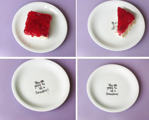 Mmm que rico postre... Mamá, vas a ser abuela. ¿Imaginas la cara de sorpresa que pondrá tu madre cuando vea el mensaje en el plato? Invítala a tomar el té con la excusa de contarle algo importante, estará ansiosa por saber qué es, pero ¡jamás imaginará que se lo dirás de esta forma!