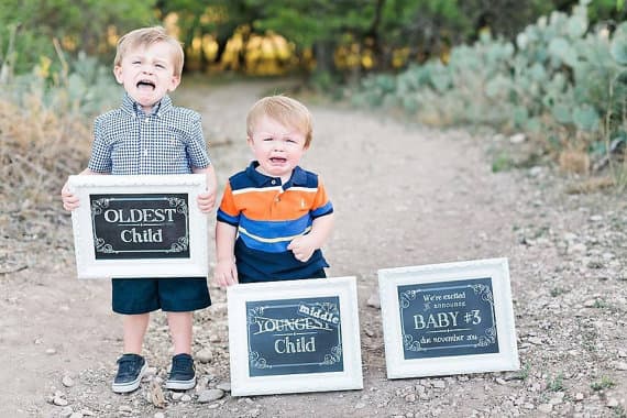 El mayor, el del medio y el nuevo HERMANITO. ¡Qué caritas!, pero sin duda es una forma muy original de dar la noticia. Puedes tomar una foto de tus hijos similar a esta y enviársela por mail o WhatsApp a tus amigos, ¡seguro que te responderán enseguida!