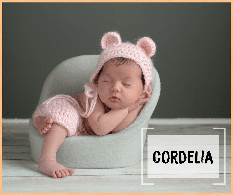Significado: "joya del mar". No se conoce con exactitud de dónde proviene el nombre de Cordelia, pero existen algunas teorías que lo dotan de significados diferentes. Además del relacionado a las aguas, también se cree que significa "corazón de león" o simplemente "corazón". Cualquiera de ellos es igual de hermoso.