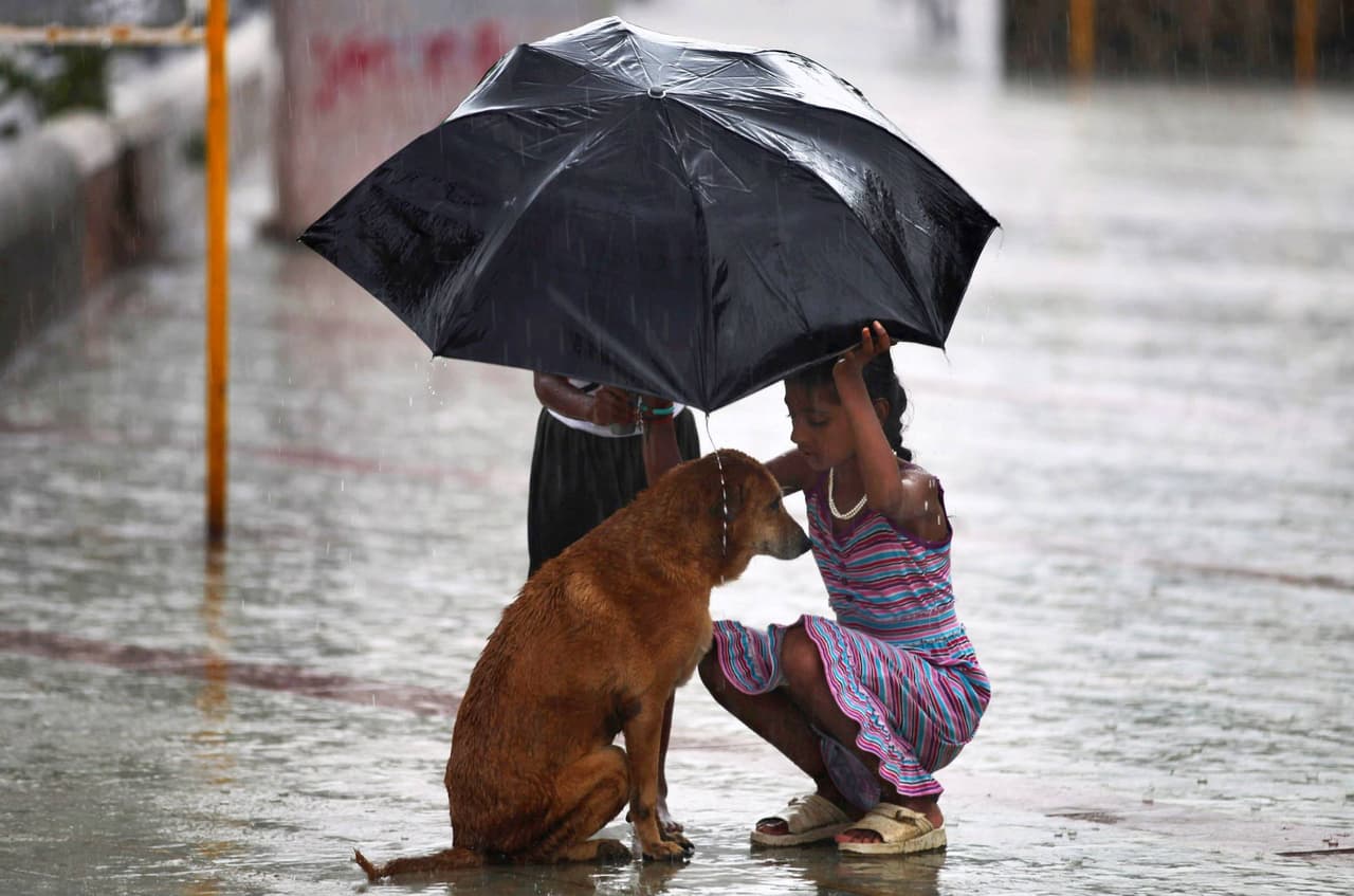 Esta niña usa su paraguas para proteger a un perro callejero de la lluvia