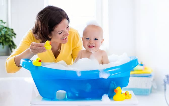 El baño es como un parque de diversiones multi sensorial. En este es posible lograr que el bebé se estimule utilizando su olfato, tacto, vista y el oído. Está comprobado que así, jugando y hablando con él mientras chapotea, establecemos vínculos y lo ayudamos a desarrollar su lenguaje. Añadir música también estimula partes del cerebro relacionadas con la memoria y las imágenes visuales. Y algo tan simple y divertido como las burbujas contribuye al desarrollo de la coordinación motora.
