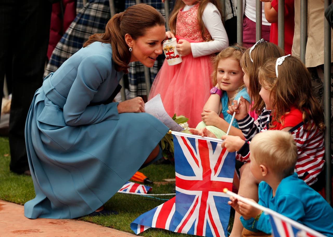 Al igual que Meghan Markle, Kate se pone de cuclillas para conversar con los niños y escucharlos mejor, y no le importa si está usando un vestido.