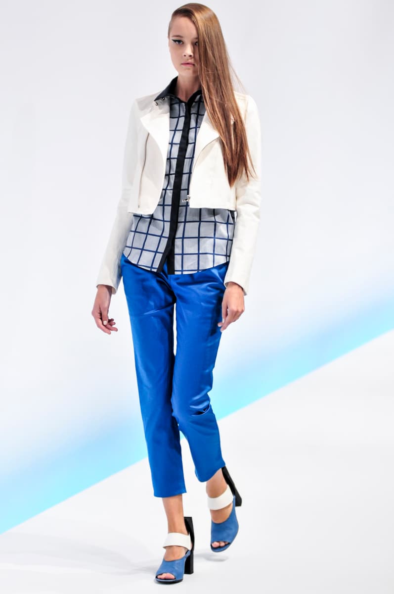 #8 Pantalón azul eléctrico con blusa blanca y abrigo gris