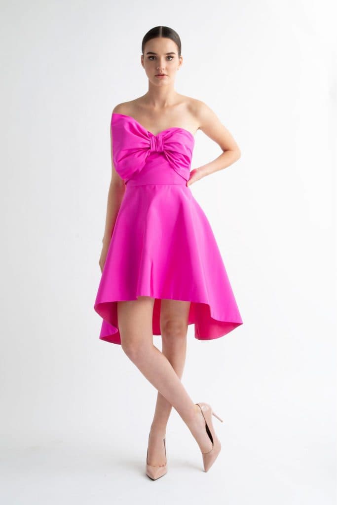 El color rosa intenso es una excelente idea para darle un boom de color a tu estilo. Además, este color luce increíble en vestidos cortos o midi.