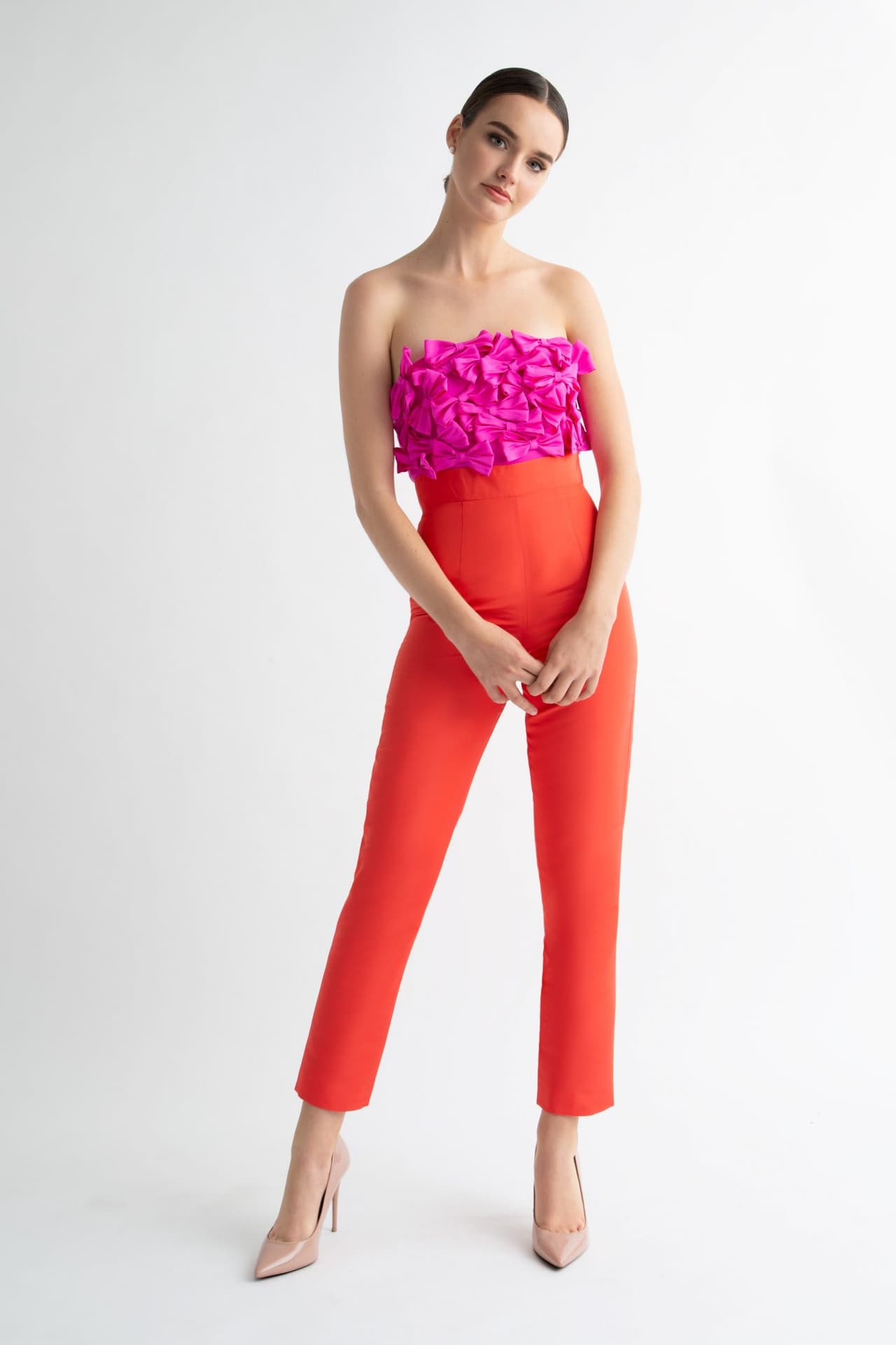 Sabemos que no todas las mujeres son fan de los vestidos así que también existen increíbles opciones para vestir pantalón. Puedes probar con un pantalón de cintura alta combinado con un crop-top, si este tiene algún tipo de detalle, mucho mejor. Te recomendamos que busques colores vivos e intensos para ambas piezas.