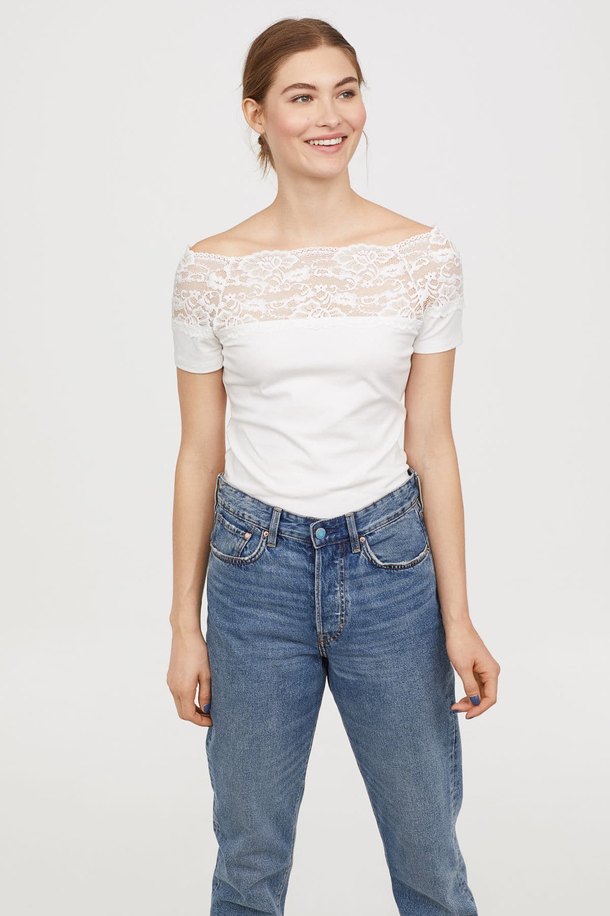 Probablemente el encaje es lo de hoy y para muestra este top. Es de manga corta y tela suave con escote amplio y una pretina al rededor de los hombros, de encaje ancho. Un look verdaderamente angelical.