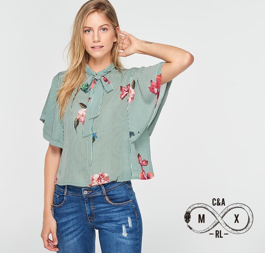Este tipo de mangas se encuentran muy en tendencia recientemente. El toque encantador de este top es la corbata de moño y la combinación entre estampado a rayas y unas flores muy folclóricas.