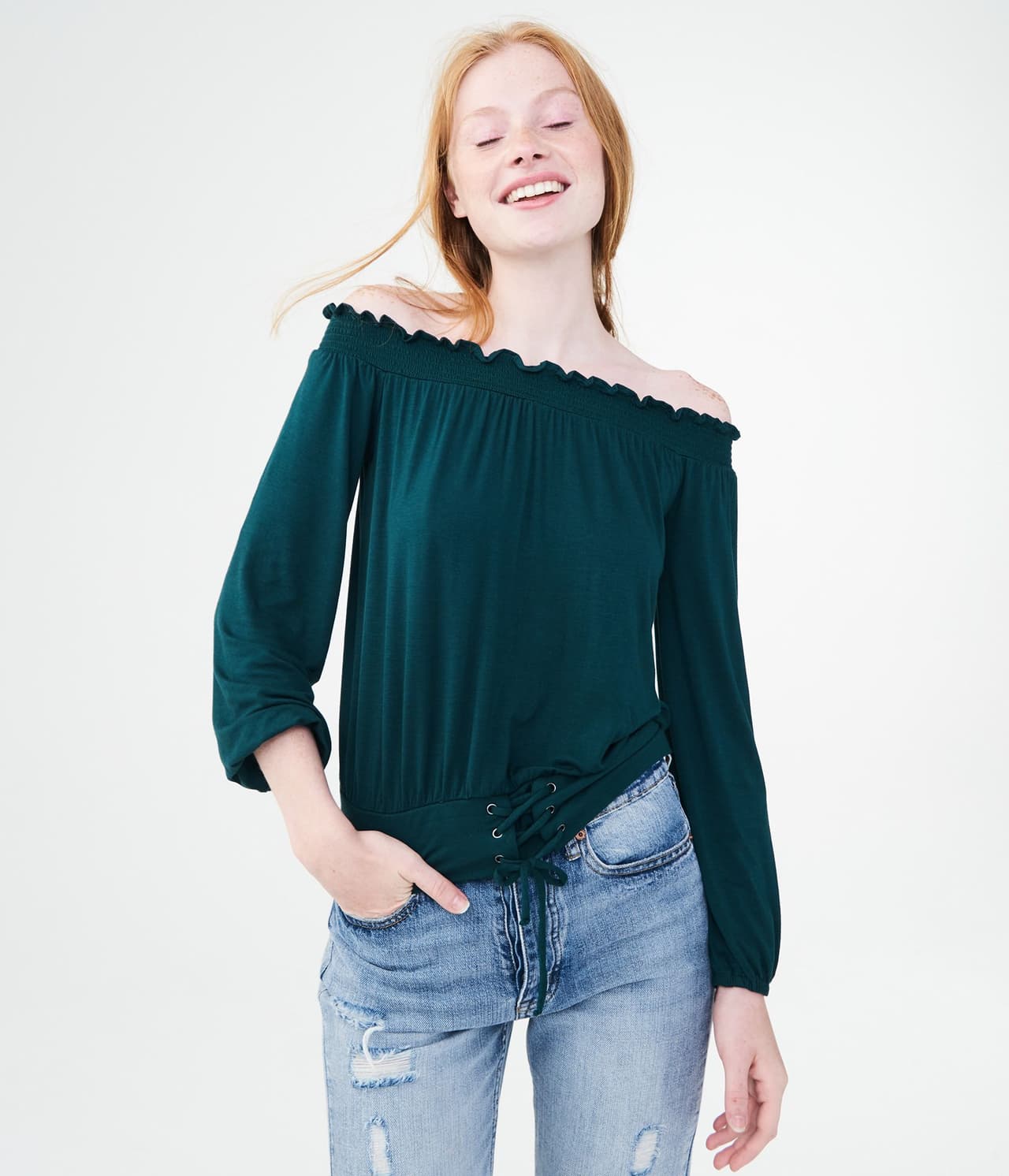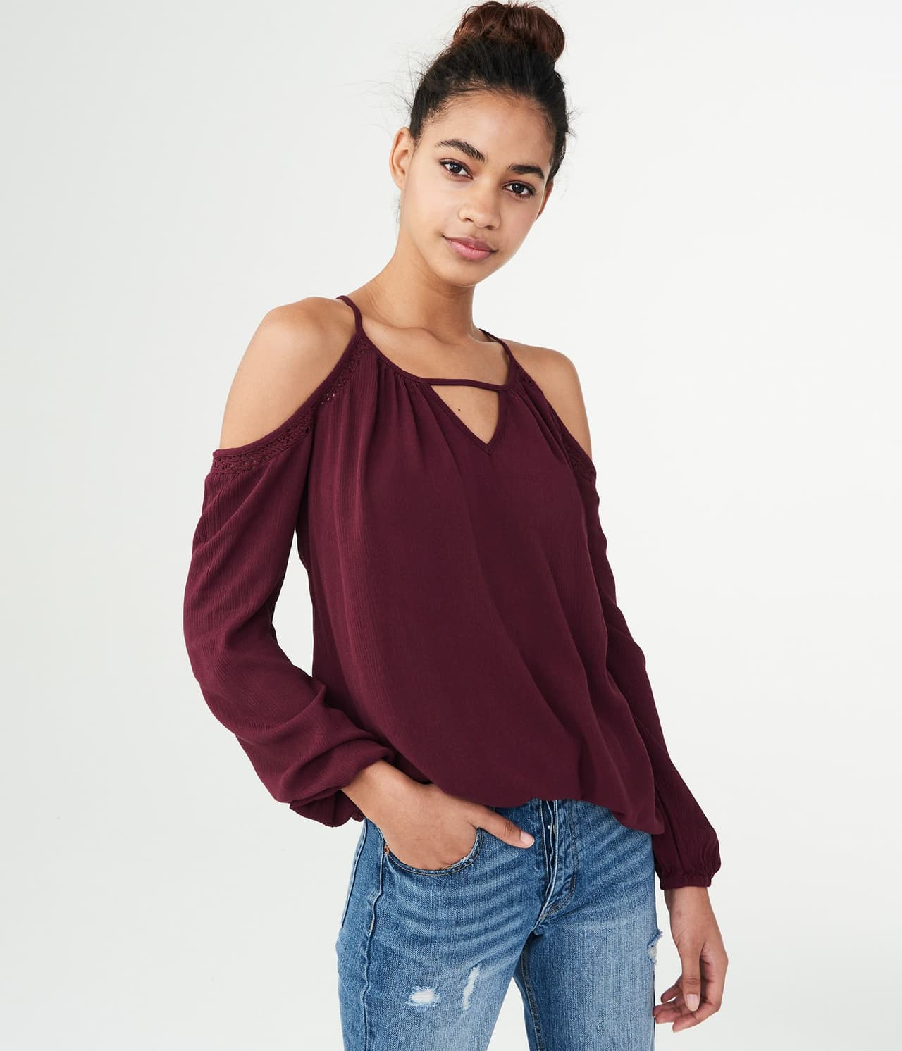 Este top con hombres descubiertos y manga larga es realmente elegante. Esta bonita pieza luce adornos de encaje, mientras que la tela es liviana y cómoda.
