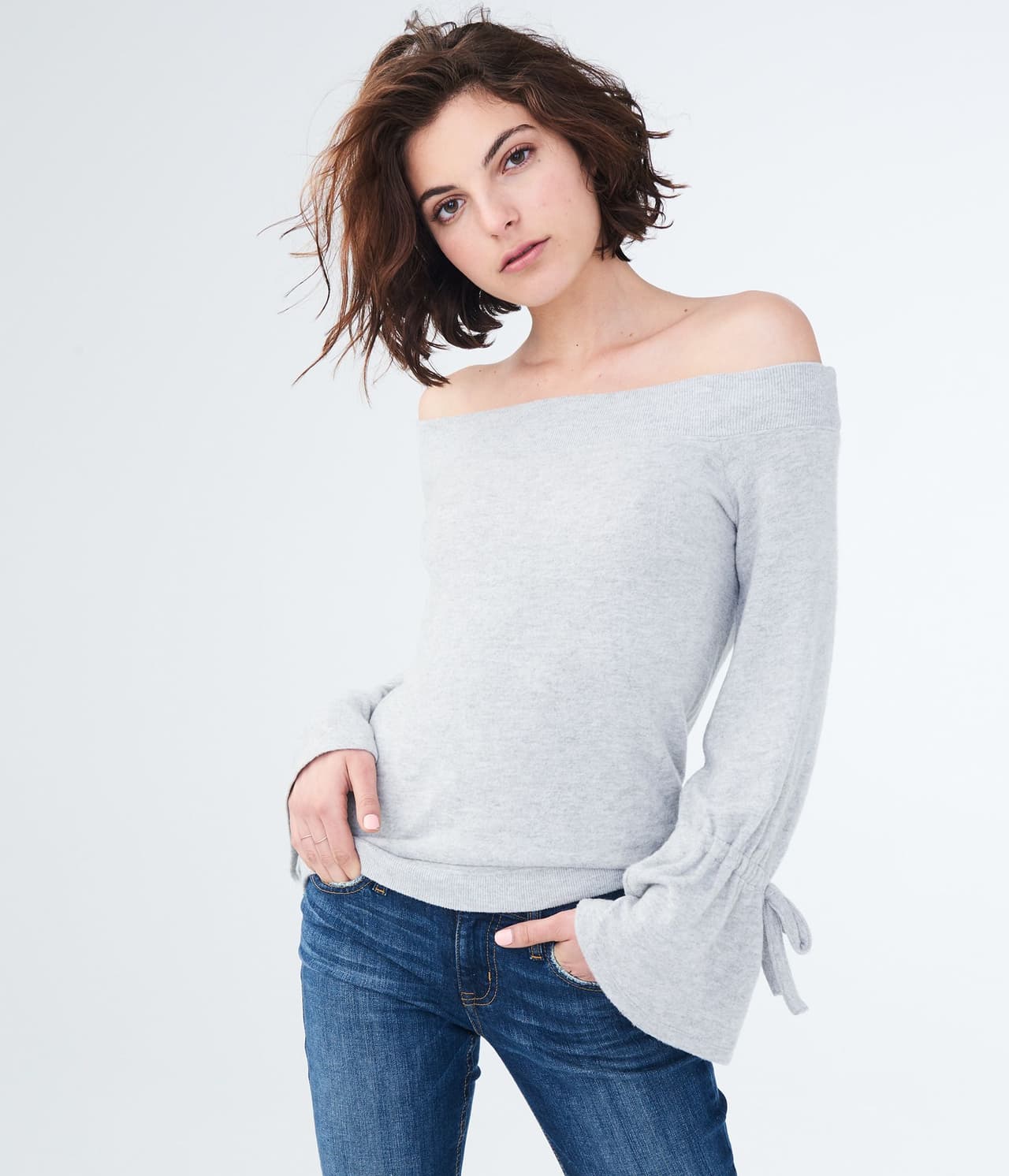Para todos tus compromisos del fin de semana, aprovecha tu lado más casual combinando tus jeans con este suéter y unos tenis blancos. Las mangas acampanadas te darán un toque dulce al final.