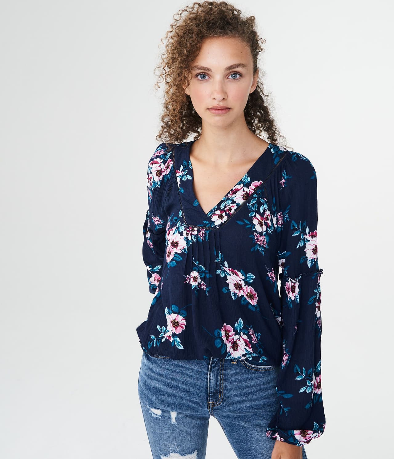 Muestra un estilo romántico y fresco con un top plisado por el frente y con un estampado floral. La manga larga es una buena opción para los días en que el clima cambia de un momento a otro. Esta encantadora pieza presenta pliegues debajo del escote, mientras que el elástico en los puños y la cintura lo hacen más cómodo.