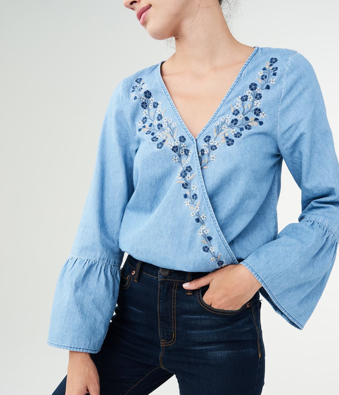 Te encantará lo lindo y femenino de este estilo, con un bordado para resaltar cuando lo combinas con una mezclilla más oscura en tus jeans. El frente con cuello en "v" y envolvente presenta, además, un broche para mantenerlo asegurado, mientras que una cintura elástica y mangas acampanadas le dan una vibra más bohemia.