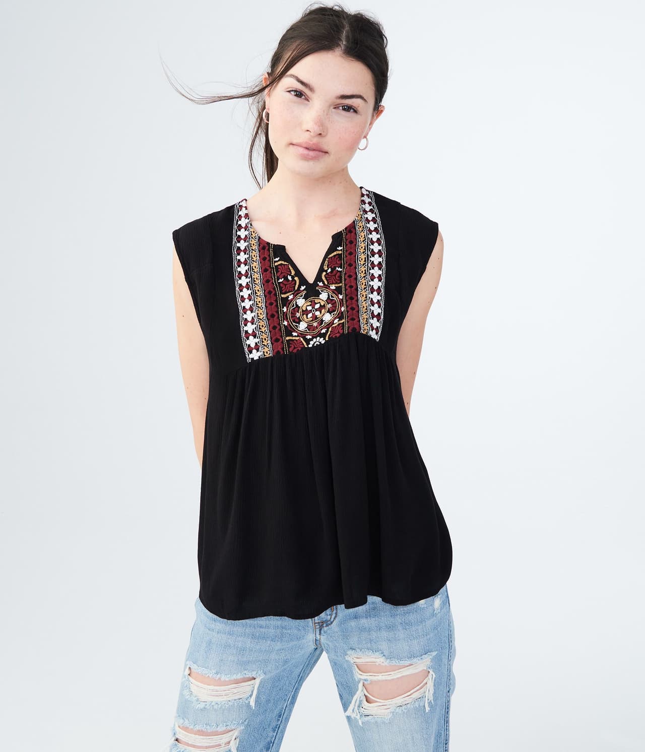 Opta por un top primaveral con accesorios sencillos, para tener un atuendo ganador. Esta bonita pieza presenta bordados llamativos y coloridos que acentúan el frente, y un corte relajado para los días de calor.