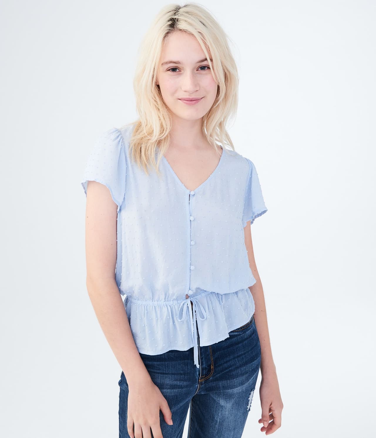 Luce tierna y delicada con esta blusa suave, botones en la parte delantera y una cintura de olán ajustada por un cordón coqueto. Ideal para una cita en el verano o un paseo por la playa.