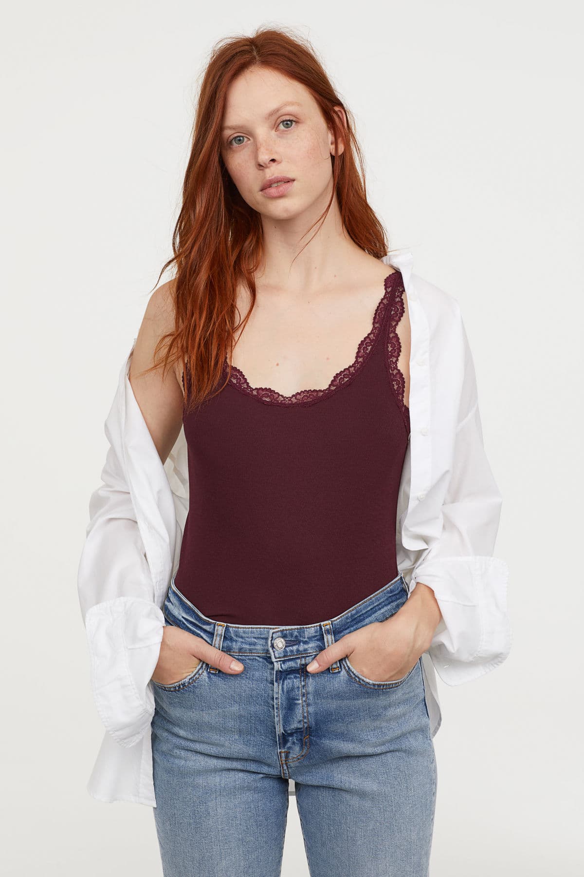 Mantén un look muy chic en las calles colocando una camisa holgada por encima de un top de tirantes con un suave ribete de encaje en el cuello. Agrega una bolsa de pequeña para lograr el atuendo ideal de sol a sol.