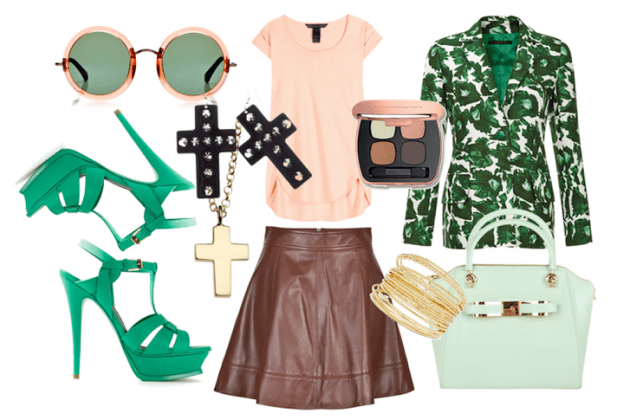 El marrón es un color ideal para un look de oficina. Sin embargo, no tiene que ser un look aburrido y tradicional. Añade una falda acampanada de cuero marrón y combina un blazer floral en tonos de verde y zapatos y bolso de igual color.