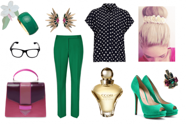 La combinación del verde esmeralda con el negro es una de mis favoritas y te permitirá crear un gran look de oficina. Combina un pantalón verde con una camisa negra a lunares de manga corta, añade accesorios en verde como un brazalete y los zapatos de tacón y elige otro color intenso y atractivo como el rosa para la cartera. Este Look Fresh Jasmin es muy atractivo, ¿no crees?
