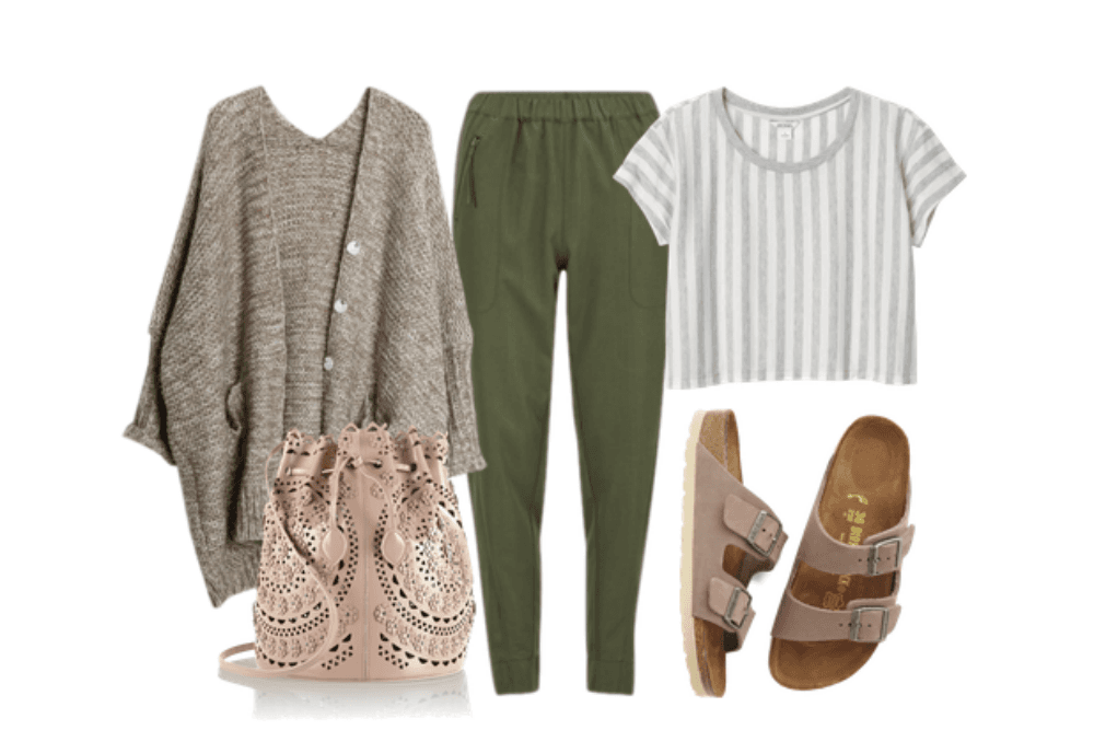 Combina tu pantalón con una camiseta crop top a rayas en tonos neutros, agrega un cardigan marrón y unas sandalias nude.