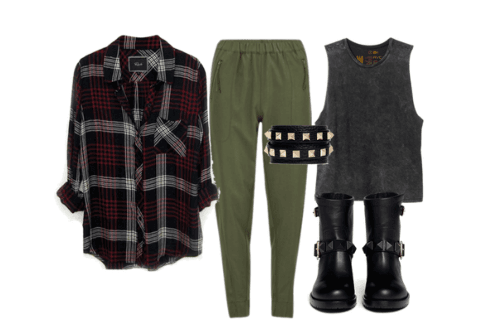 Para un look casual más audaz, inspírate en este look Casual Edge. Combina tu pantalón militar con una camiseta gris, agrega unas botas negras y una camisa a cuadros.