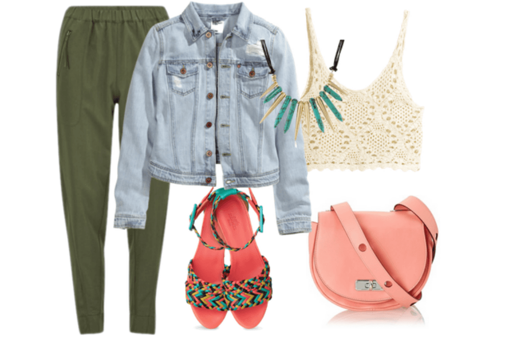 Si quieres un look alegre, original y divertido, el look Colour Fun es para ti. Combina tu pantalón militar con un crop top beige de encaje.