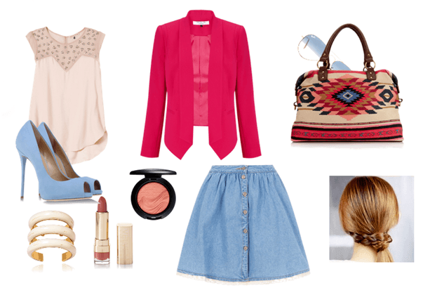 Si quieres algo más colorido, no dudes en combinar el celeste pastel con el fucsia. Combina una falda celeste con una blusa rosa pastel y unos zapatos celestes. Añade el blazer fucsia para darle el toque de color y una cartera estampada y colorida en tonalidades similares.