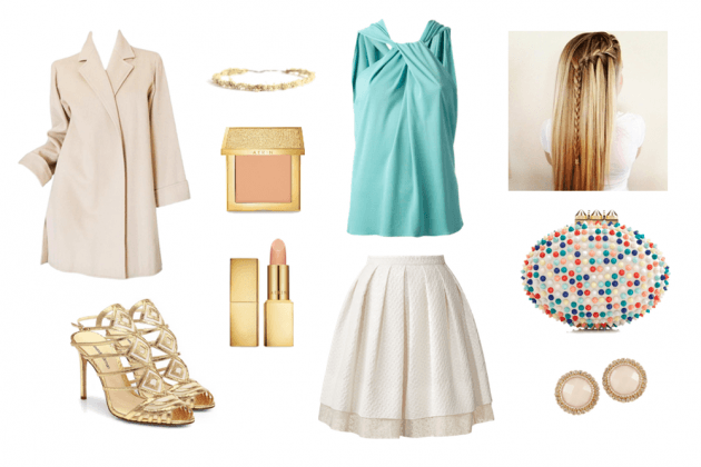 Si quieres un atuendo más clásico y elegante, el Look Casual Chic será tu gran inspiración. Solo tienes que combinar una falda blanca acampanada con un blazer nude y accesorios con dorado. Para sumar color al atuendo combina con una blusa turquesa y un clutch colorido que haga juego con el look.