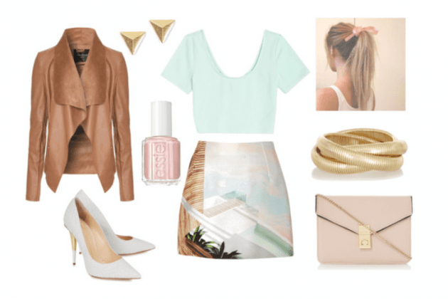 Si prefieres un look moderno y sensual, este Look Leather Nude es ideal. Combina una minifalda estampada con un crop top liso, una chaqueta de cuero marrón y unos zapatos de tacón blancos.