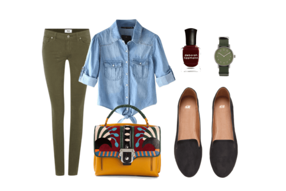 Elige un pantalón verde militar y combina con tu camisa, añade uno cómodos flats y una cartera con personalidad.