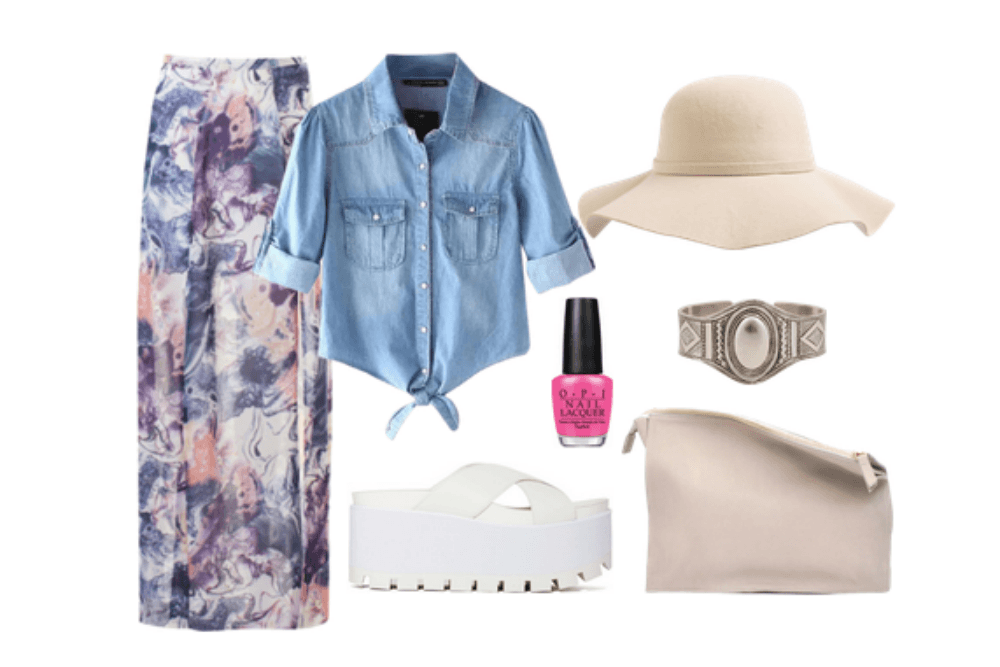 Vestir femenina y elegante es súper divertido. No dudes en combinar tu camisa de jean con una maxi falda estampada, agrega unas plataformas, un clutch nude y una capelina a tono y tendrás un look súper trendy.