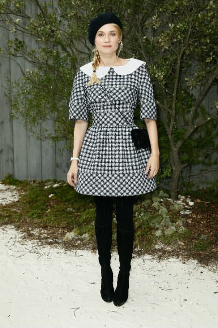 Si quieres un look moderno, femenino y elegante, la boina también te servirá como accesorio. Solo tienes que combinarla con un vestido con cuello como este de Diane Kruger, estampado en blanco y negro.