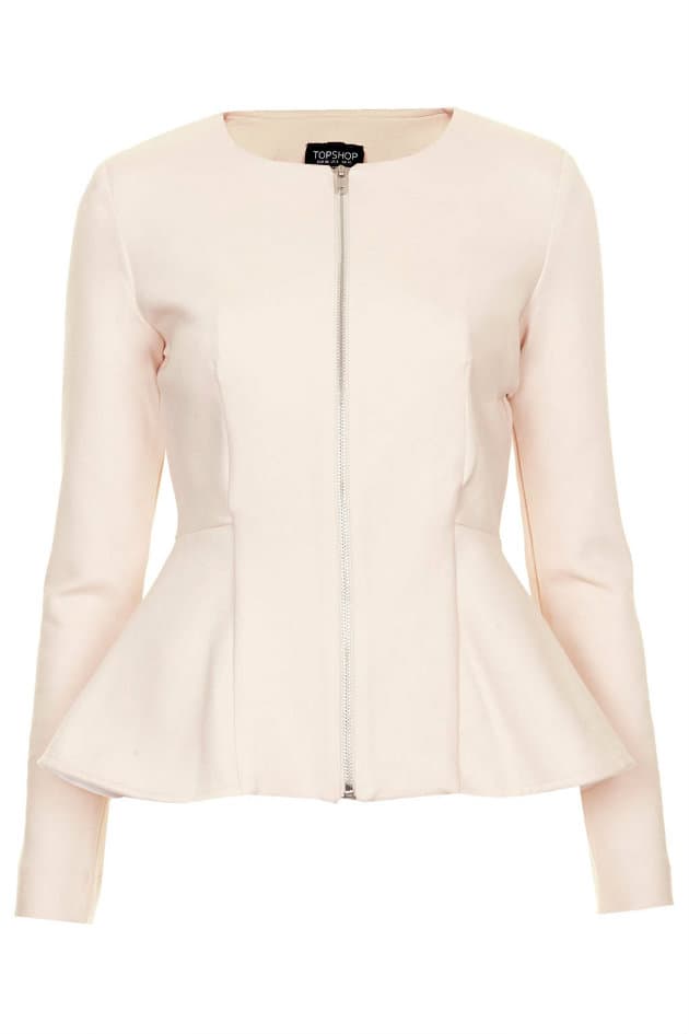 Para realizar esto, la chaqueta debe llegar hasta la parte más ancha de tus caderas; no más abajo, no más arriba. El estilo peplum, como la de la foto, estructurará tu imagen creando visualmente más forma en las caderas para lograr equilibrar el cuerpo. Observa la parte posterior y elige las que tengas pinzas en forma de parentesís, es decir, “)(“, esto te ayudará a acentuar tu cintura.