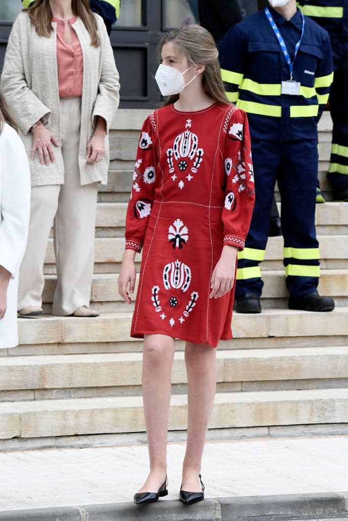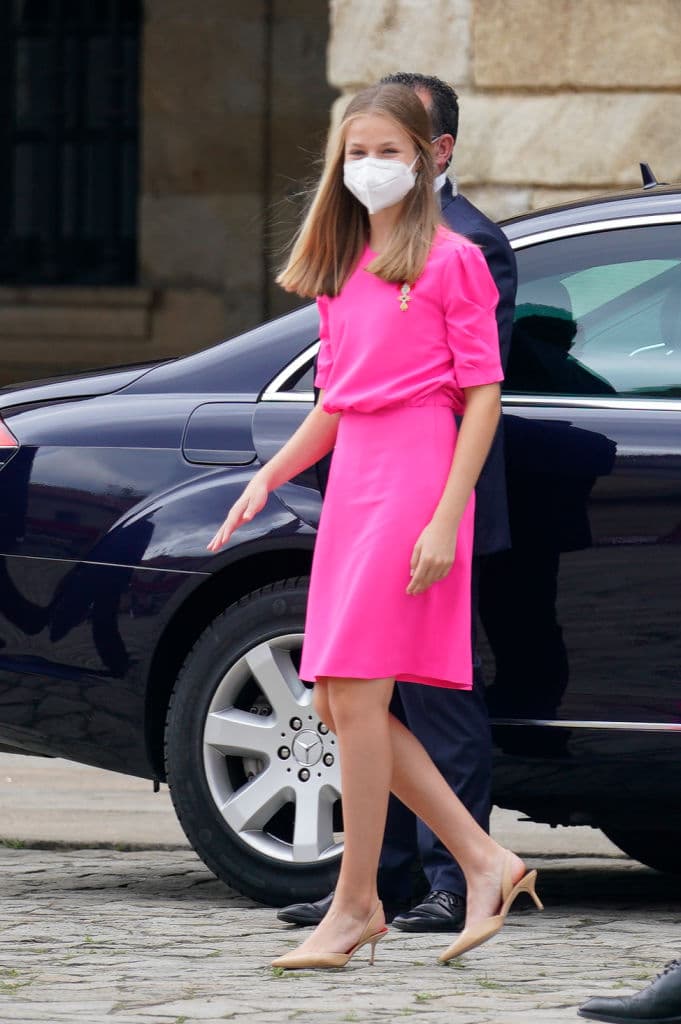 Leonor usó este vestido a finales de julio, el cual tenía mangas puffy hasta el codo y llegaba arriba de las rodillas. El color hacía notarla de inmediato y lo acompañó con unas zapatillas de tacón bajo color beige. ¡Extrañamente sí funciona!
