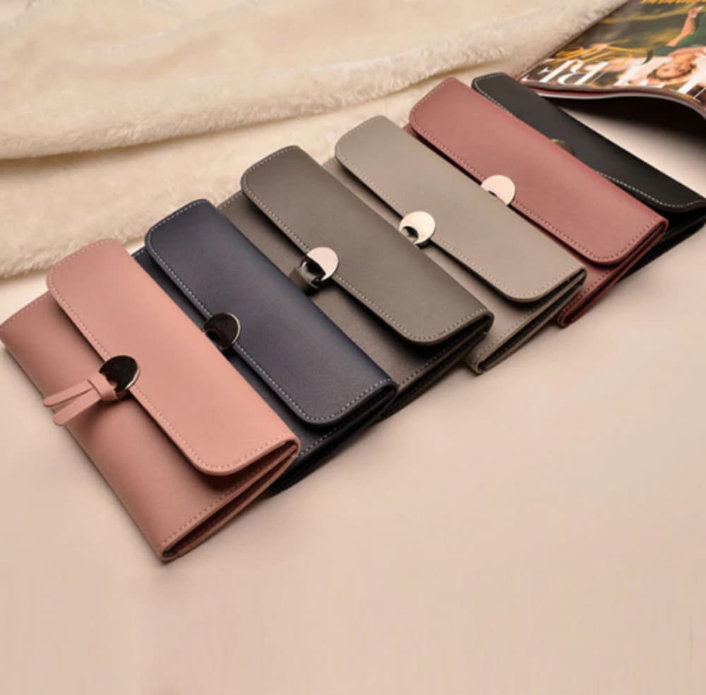 Hecho de cuero, esta cartera trae un detalle especial en el cierre que añade encanto al producto. Perfecta para toda ocasión, permite guardar cualquier documento y tarjeta. Disponible rosa, beige, gris, azul y vino. Su precio es de US $9.50