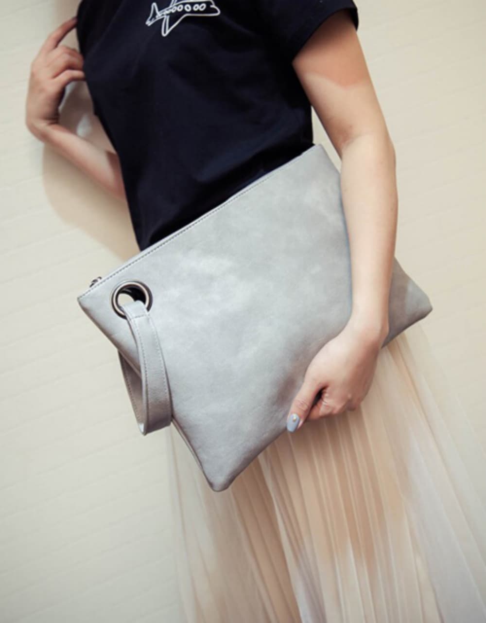 Hecha de gamuza, esta bolsa/cartera es perfecta para quienes adoran los estilos románticos y sofisticados. Está disponible en gris, azul, rosa, negro, marrón y verde. Sólo tendrás que pagar US $7.