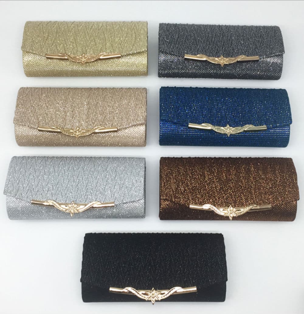 Esta bolsa es muy usada en fiestas y ocasiones especiales. En un estilo de cartera gigante que te permite colocar muchos objetos dentro de ella. Disponible en gris, rosa, verde agua, beige y azul. El valor es de US $4.89.