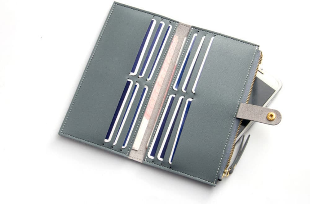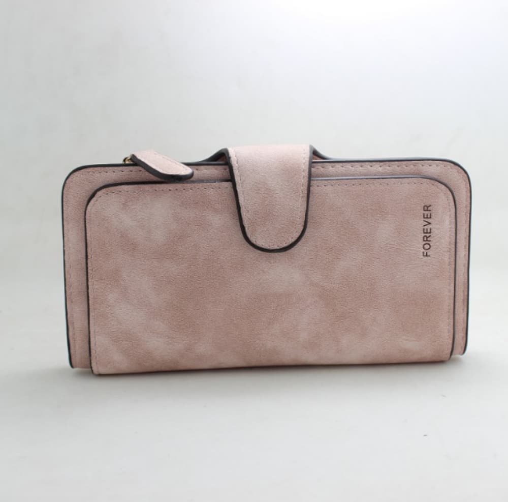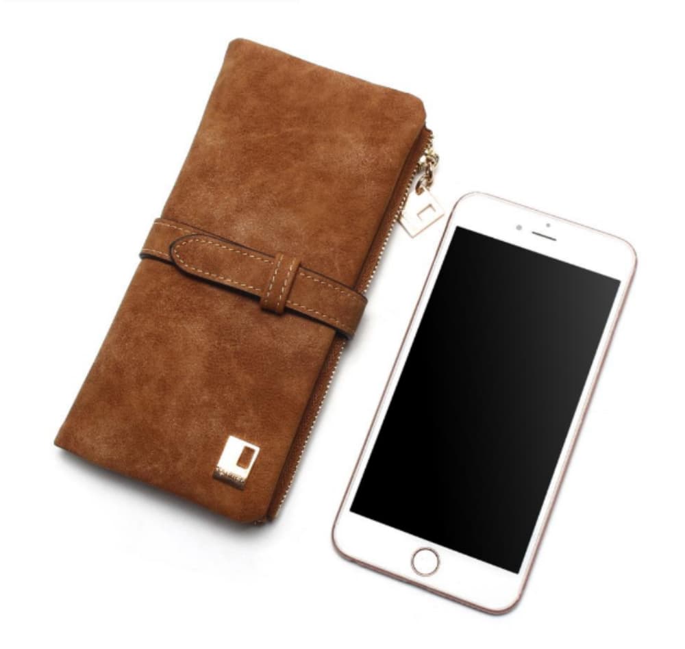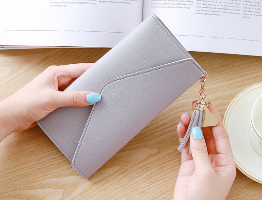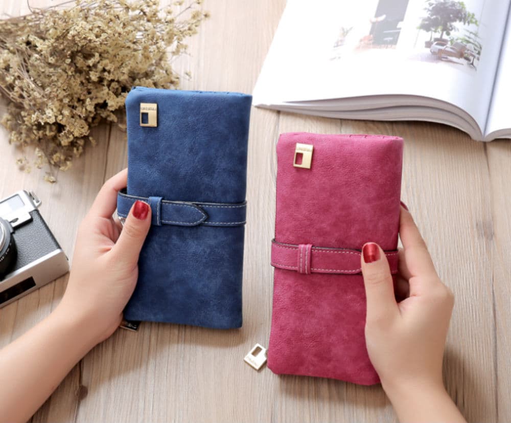 Esta cartera es perfecta para guardar los documentos y tarjetas de crédito. Su diseño es hermoso y está hecho de gamuza, lo que da aún más estilo. Si no quieres llevar una bolsa más grande también es una gran opción. Disponible en azul, beige, gris, rosa y morado. Su precio es de US $5.