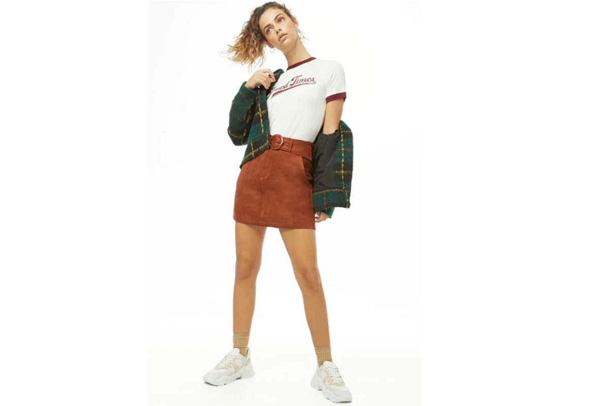 Crea un estilo old school con unos tenis de botita y una falda de pana.