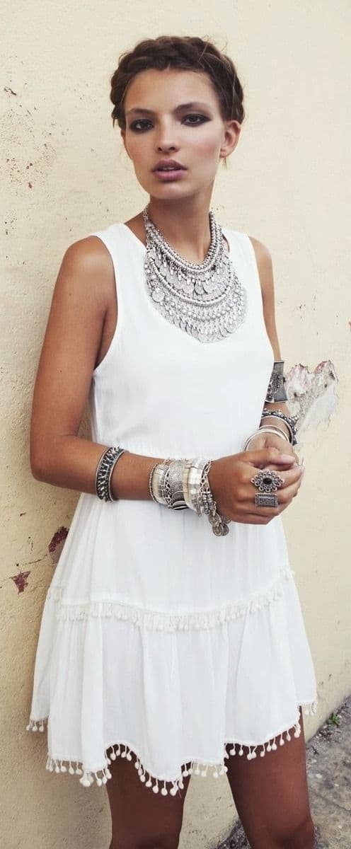 Bastan unos cuantos flecos para darle un aire romántico a un vestido liso. Mira cómo juega el collar del mismo estilo. ¿Qué te parece?