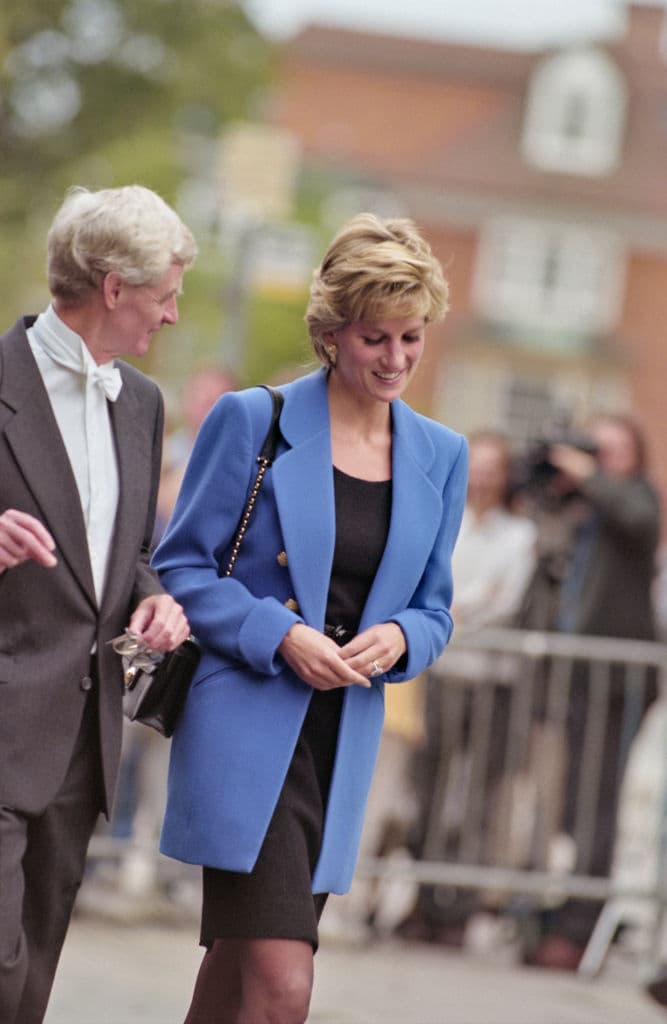 En el caso de Lady Di, eran una pieza clave en su guardarropa por lo fácil que resultaba combinarlos. Un ejemplo de ello es este outfit con un blazer oversize de color azul que combina con un vestido negro sencillo para que no le robe protagonismo a la pieza principal.