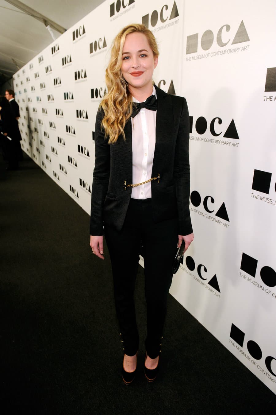 La actriz Dakota Johnson no se quedó atrás y se animó a un atuendo lleno de referencias de la moda masculina. El blanco y el negro nunca fallan sobre todo para eventos formales y cuando los combinas con dorado luce realmente bien.