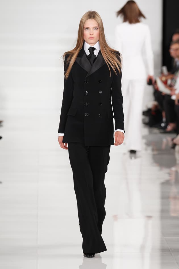 Uno de los diseñadores que adoptó este estilo, es Armani. Con pantalón ancho en color negro, y chaqueta combinada haciendo juego. El detalle: el sombrero. El diseñador Balenciaga, es fiel a su estilo, y con algo de rocker, eligió una chaqueta de cuero en color blanco y negro; acompañada por un pantalón pitillo en satén.
