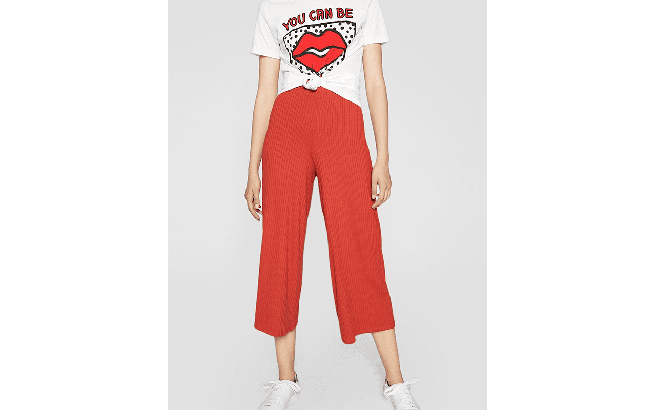 Unos pantalones de color terracota pueden convertirse en una opción relajada y despreocupada, si los combinas con una playra blanca que exhiba algún estampado cool.