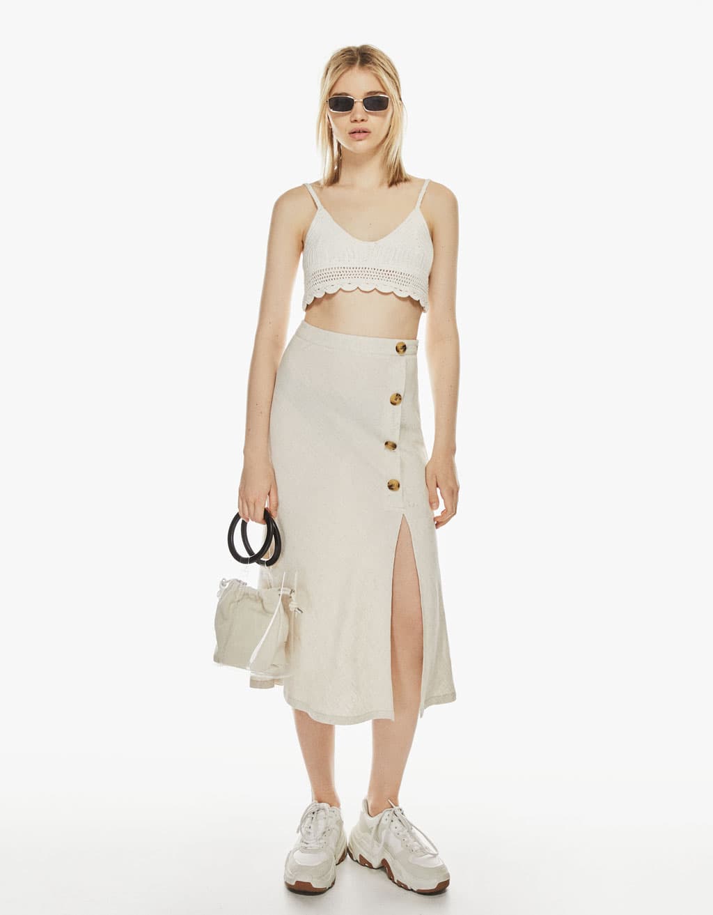 Un look de falda larga puede lucir aún más femenino y romántico si lo combinas con un sencillo y delicado bralette.