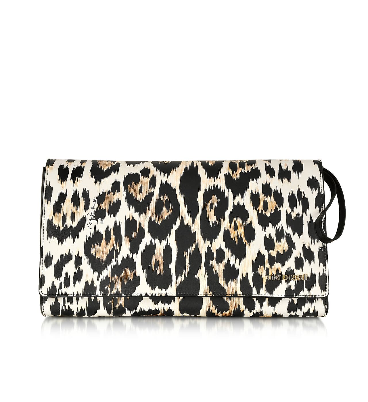 El clásico clutch de leopardo no puede faltar. Es moderno, elegante e ideal para darle vida a cualquier look, sea un vestido de seda largo para un evento informal o una falda y crop top para una salida con amigas. Este clutch de Roberto Cavalli es fabuloso.