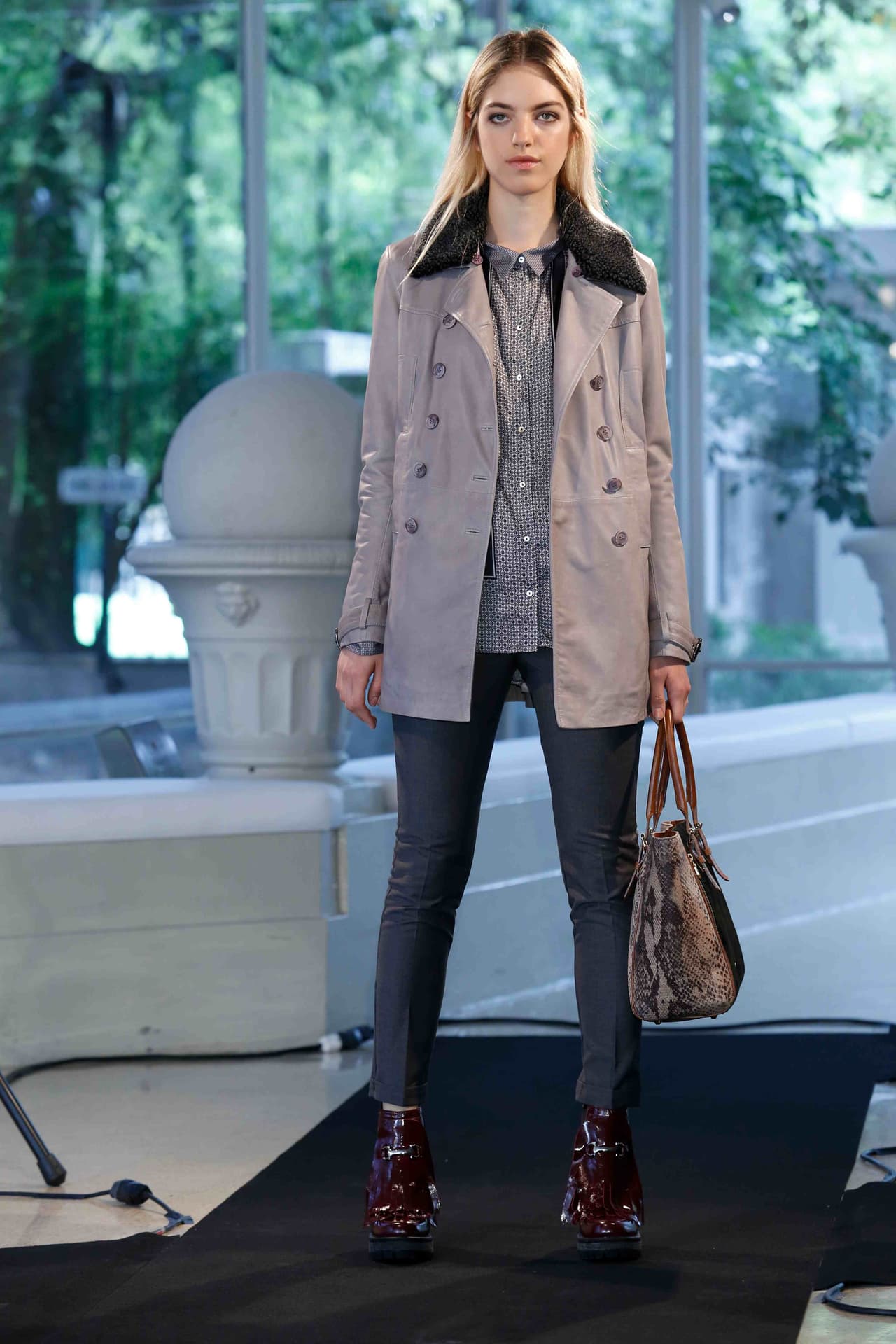 Los abrigos son oversize con un tinte retro y los materiales son nobles: gamuza, animal print y real shearling en dorado. La propuesta juega con la combinación de estilos.