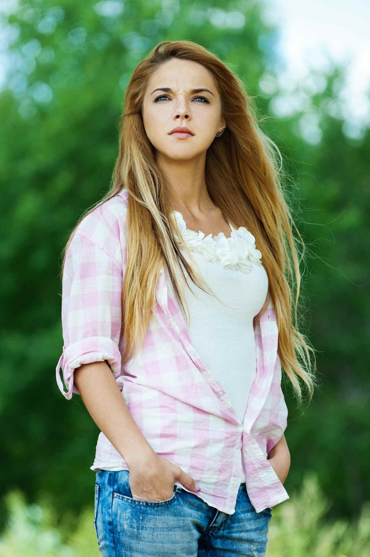 Elige alguna camisa de aspecto informal -puede ser incluso una de cuadros como la anterior- y combinala con alguna camiseta con un detalle femenino. Desabrocha los primeros botones de la camisa, dejando ver la zona del pecho de la blusa, y luego deja abrochados los del área más problemática: la pancita. Te quedará bonito, original y femenino.