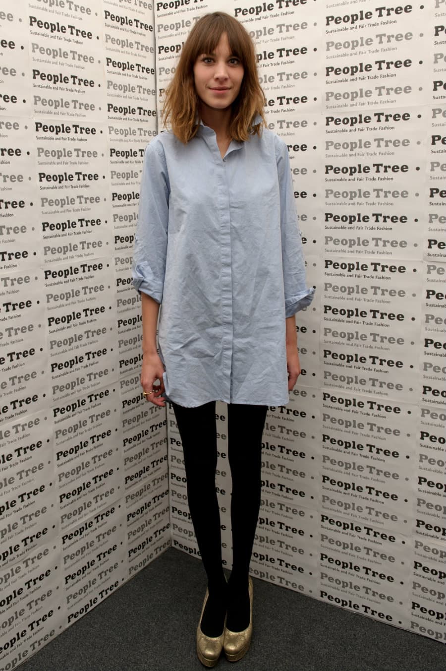 Una gran opción para incorporar las leggings en un look moderno y lindo es con una camisa larga suelta, que puedes combinar con tacones o botines. Es un gran look diario para estar bien vestida además de cómodo. ¿Te gusta cómo las usa Alexa Chung?