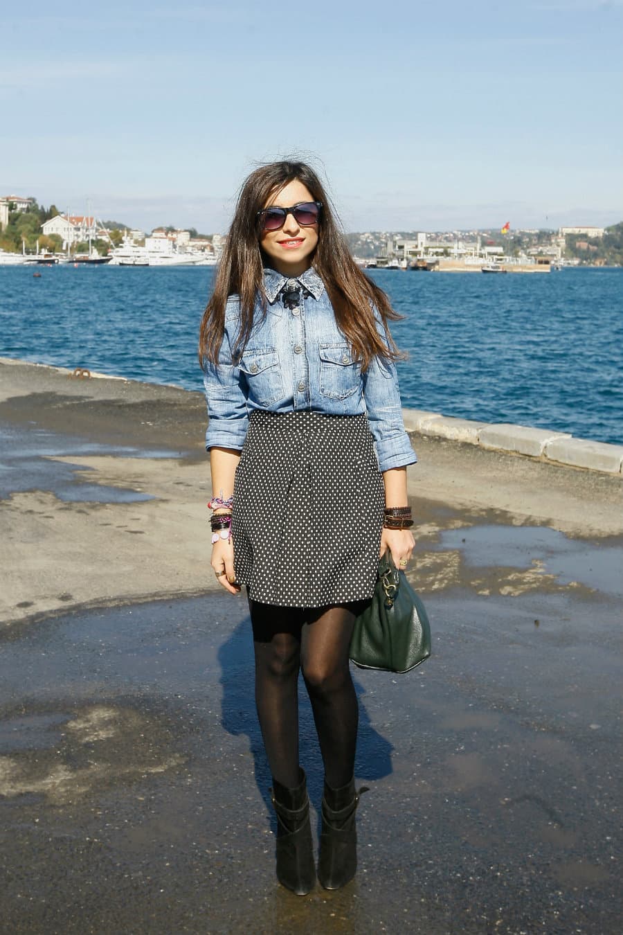 Si el clima aún esta un poco fresco, este look de falda estampada con camisa de jean es ideal para lucir increíble y puedes animarte a incorporar brazaletes siempre y cuando no recargues el look.