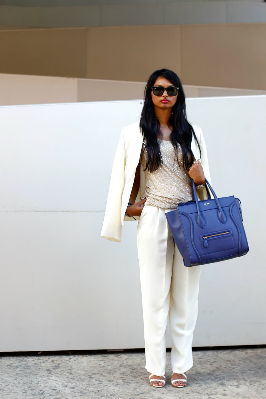 Una combinación segura es optar por prendas de colores neutros, como en esta ocasión, pero combinarlas con accesorios llamativos como la cartera, unos buenos zapatos o agregar un collar en los mismos tonos de las prendas que le de un toque pero sin recargar.