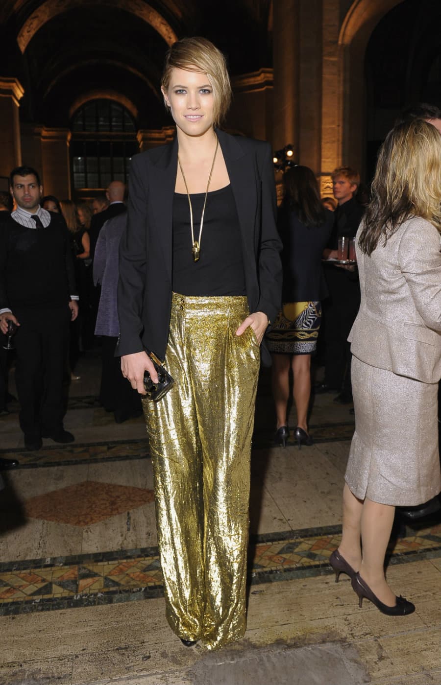 Me encanta este atuendo con el top strapless de cuero, las leggings y la falda dorada, ¿a ti no? El pelo suelto le da un aire descontracturado y me gusta la medalla como un detalle que hace juego.
